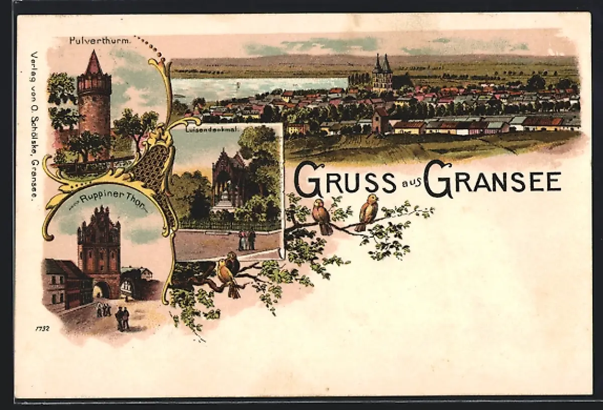 Künstler-AK Gransee, Pulverturm, Ruppiner Tor, Luisendenkmal