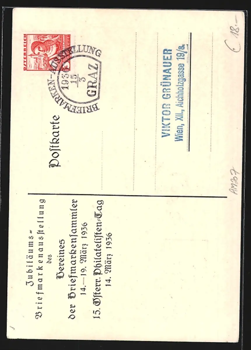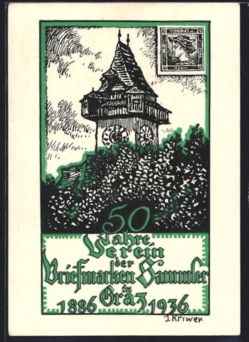 Künstler-AK Graz, 50 Jahre Verein d. Briefmarkensammler 1886-1936, Ausstellung 14.-19.3.1936, Uhrturm