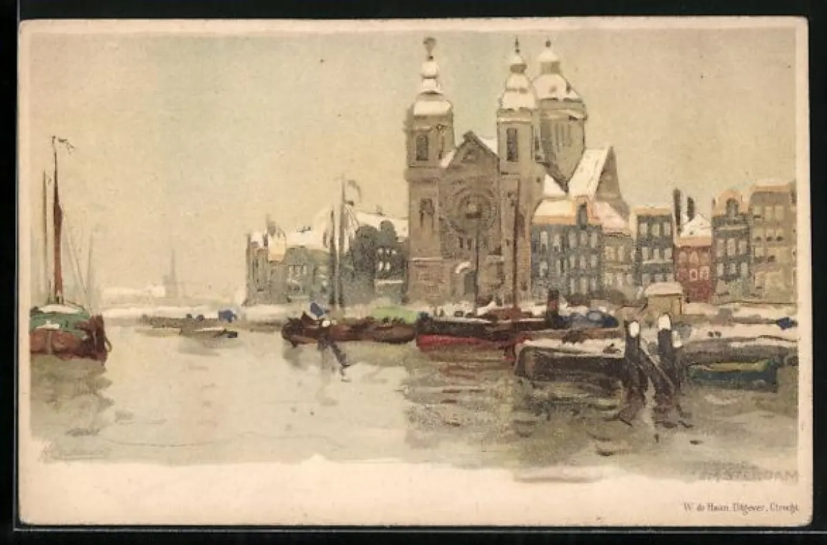 Künstler-AK H. Cassiers: Amsterdam, Wasserpartie im Schnee, Boote