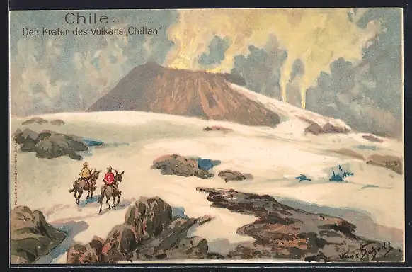 Künstler-AK Hans Bohrdt: Krater des Vulkans Chillan mit zwei Reitern