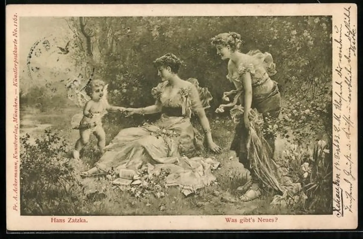 Künstler-AK Hans Zatzka: Was gibt`s Neues?, Amor und Fräuleins