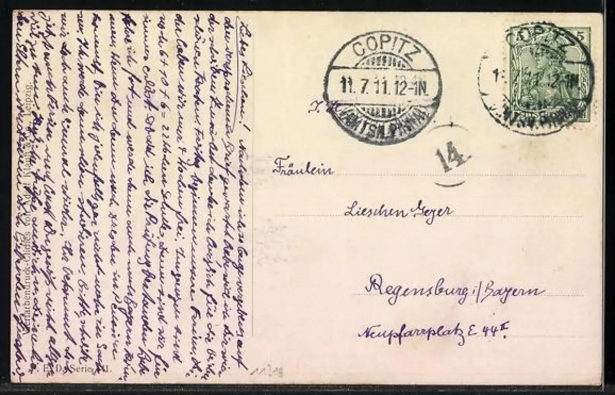 Personenbezogene Daten auf der Rückseite der Karte wurden durch blauen Textmarker unkenntlich gemacht. Die blauen Stellen sind auf die Vorderseite durchgeweicht und wirken sich negativ auf das Postkartenfoto aus