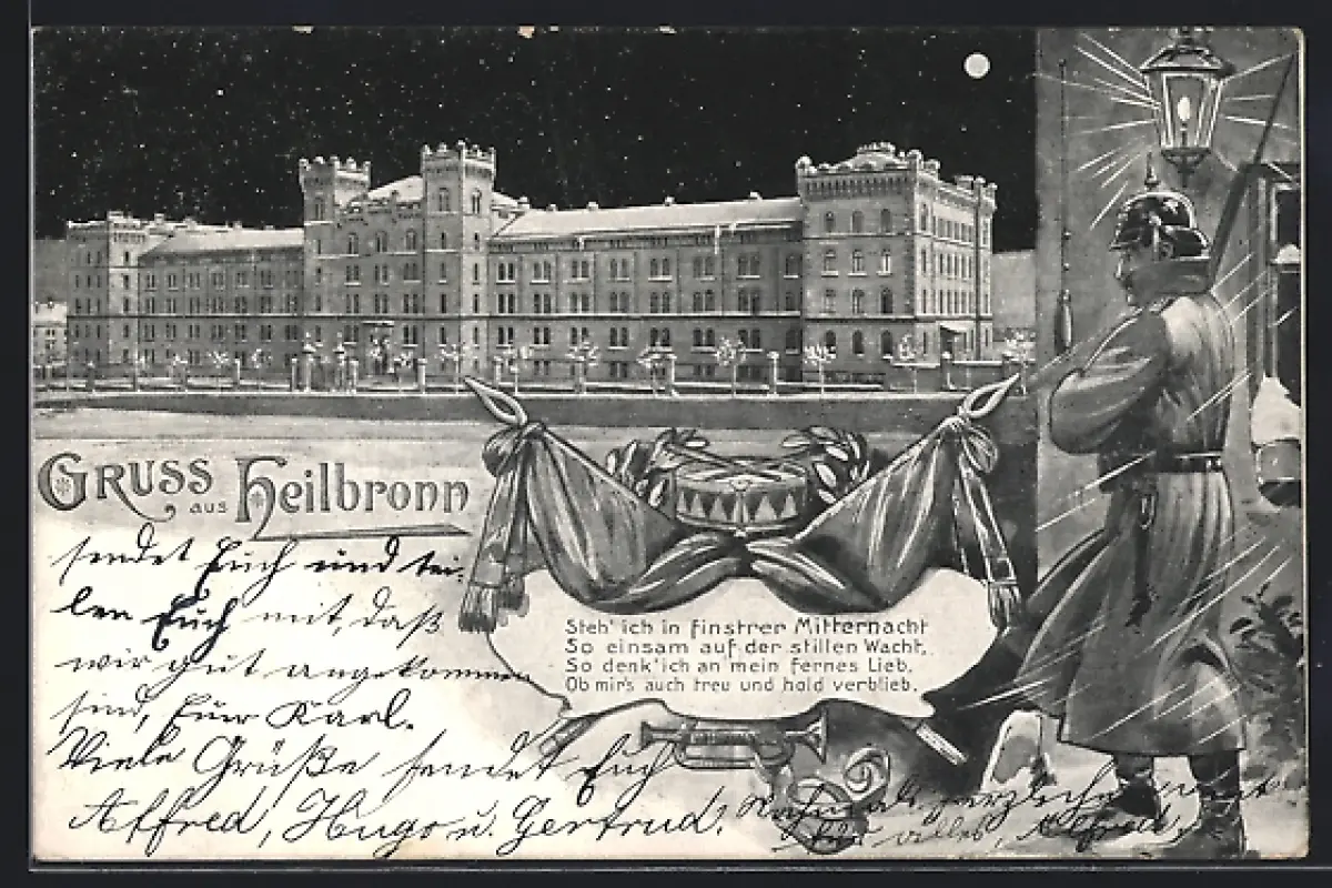 Künstler-AK Heilbronn, Kaserne bei Mondschein mit Wächter