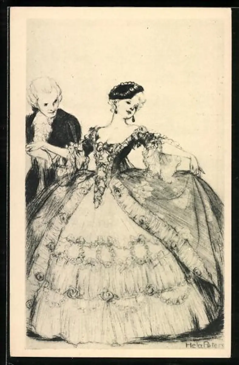 Künstler-AK Hela Peters: Herr führt Dame zum Tanz, Karte Nr. 198, Die Krinoline