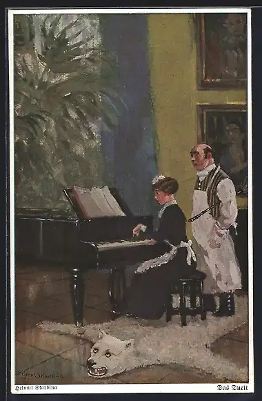 Künstler-AK Helmut Skarbina: Das Duett, Dienstmädchen beim Stimmen des Klaviers