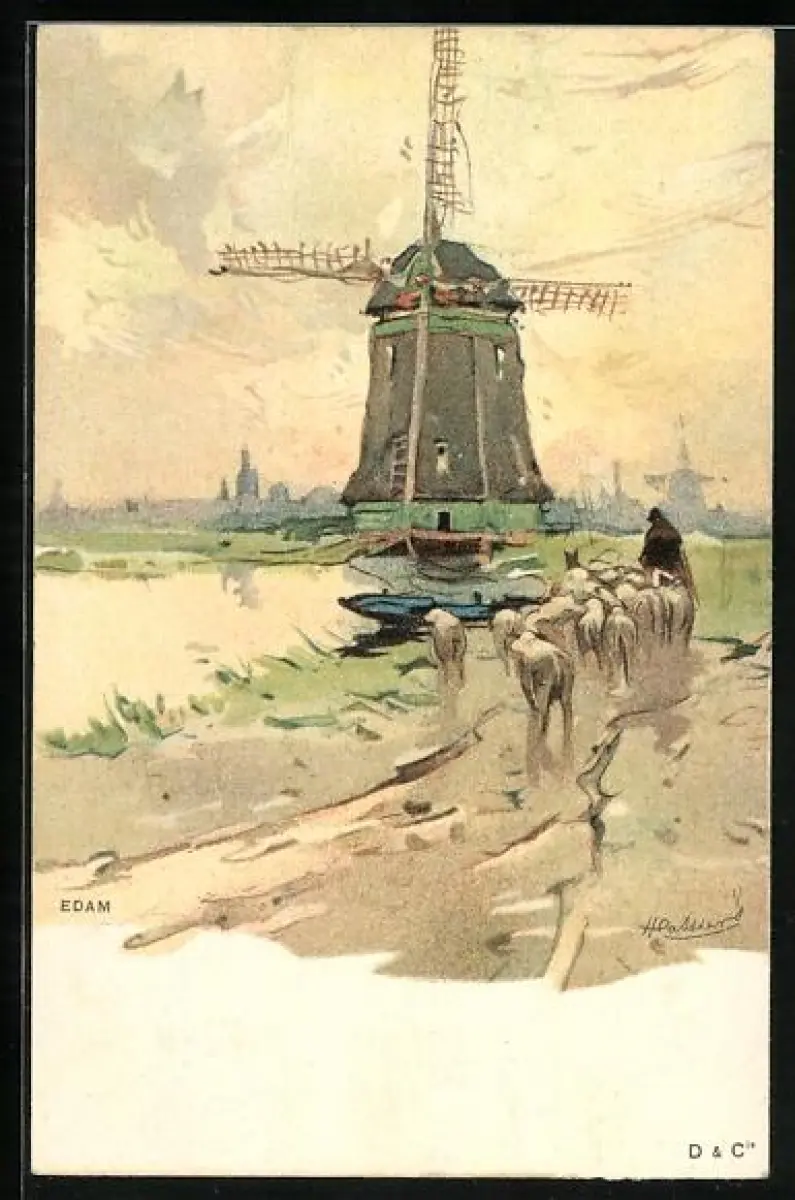 Künstler-AK Henri Cassiers: Schafhirte mit Herde an einer Windmühle