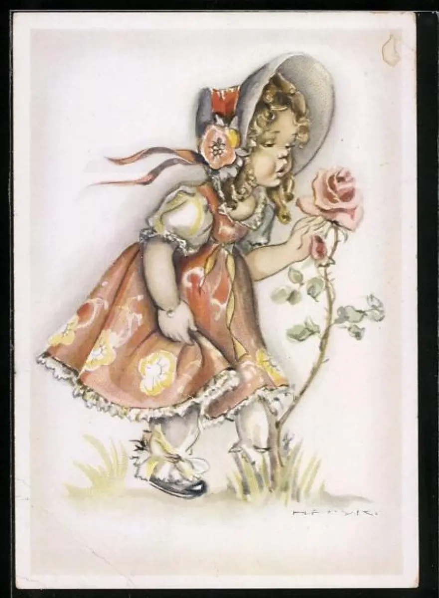 Künstler-AK Hilla Peyk: Fräulein im Kleid mit einer Rose