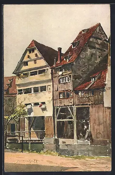 Künstler-AK J. Marschall: Alt-Ulm, Gerberhaus an der Blau