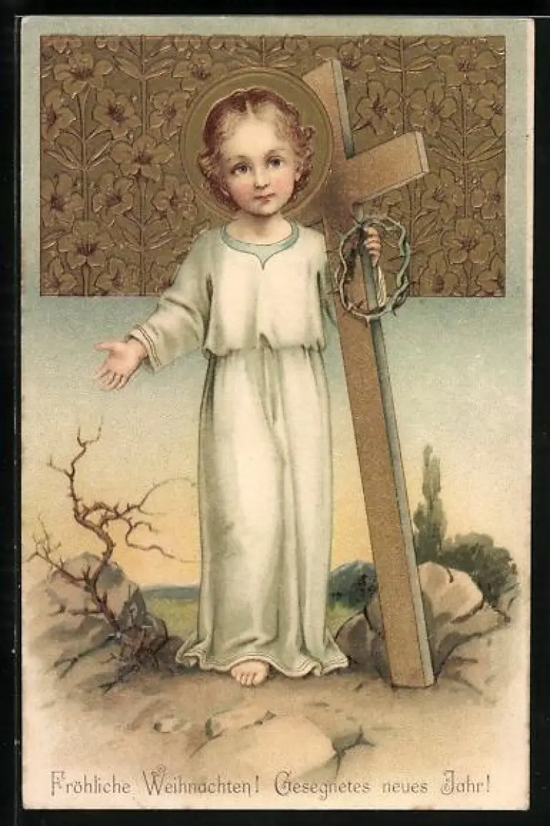 Künstler-AK Jesuskind mit Kreuz und Dornenkrone, Fröhliche Weihnachten