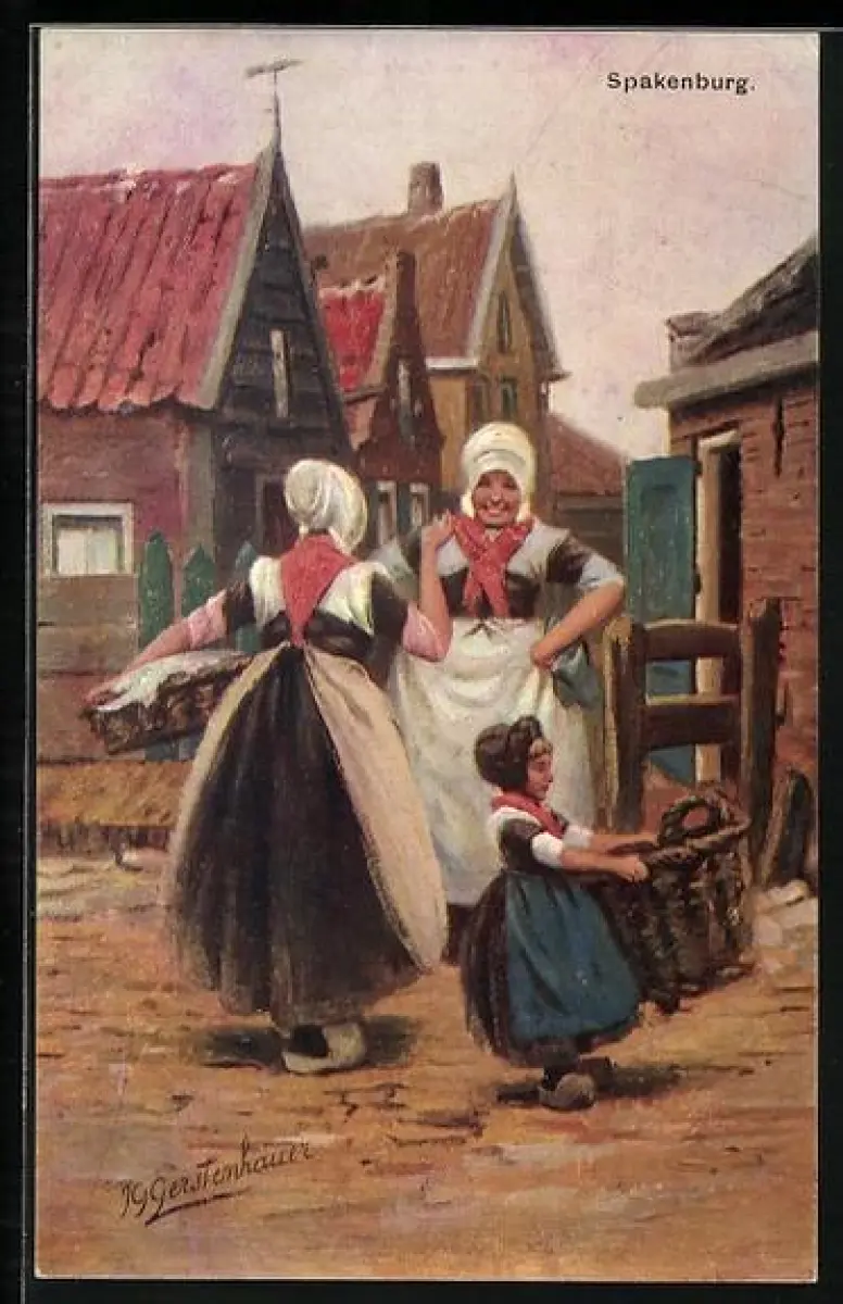 Künstler-AK Johan Georg Gerstenhauer: zwei holländische Waschfrauen im Gespräch, Mädchen schleppt einen Wäschekorb