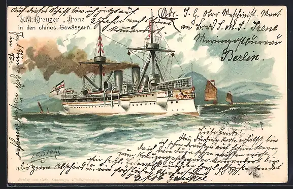Künstler-AK Johann Georg Siehl-Freystett: Kriegsschiff Kreuzer SMS Irene in chinesischen Gewässern