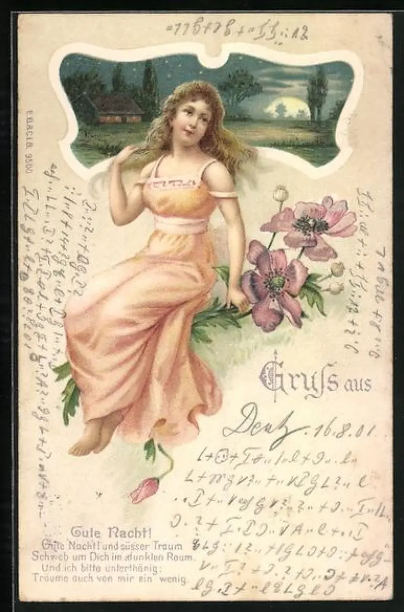 Künstler-AK Junge Frau mit Blumen vor Mondlandschaft, Jugendstil