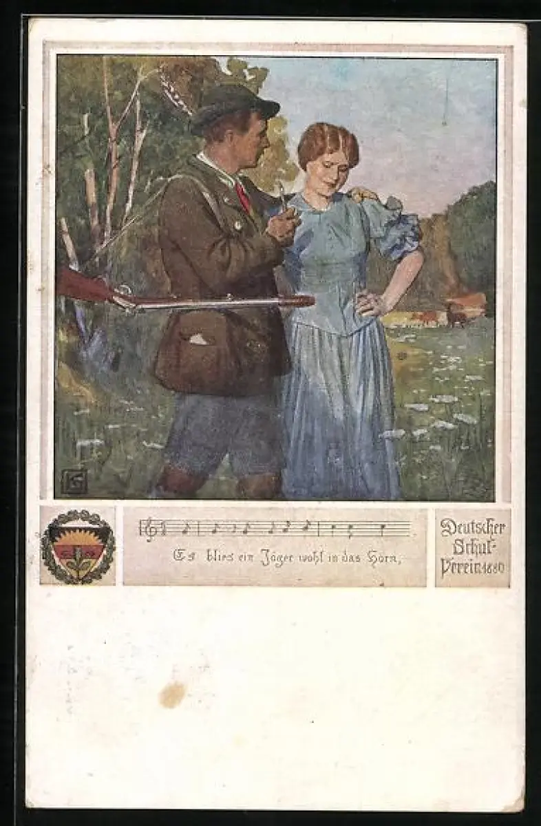Künstler-AK Karl Friedrich Gsur, Deutscher Schulverein Nr. 464: Es blies ein Jäger wohl in das Horn, Liebespaar