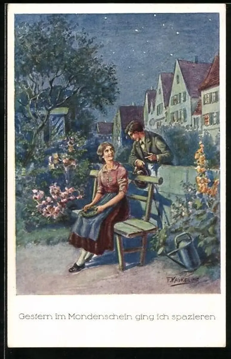 Künstler-AK Kaskeline: Liebespaar an einer Parkbank