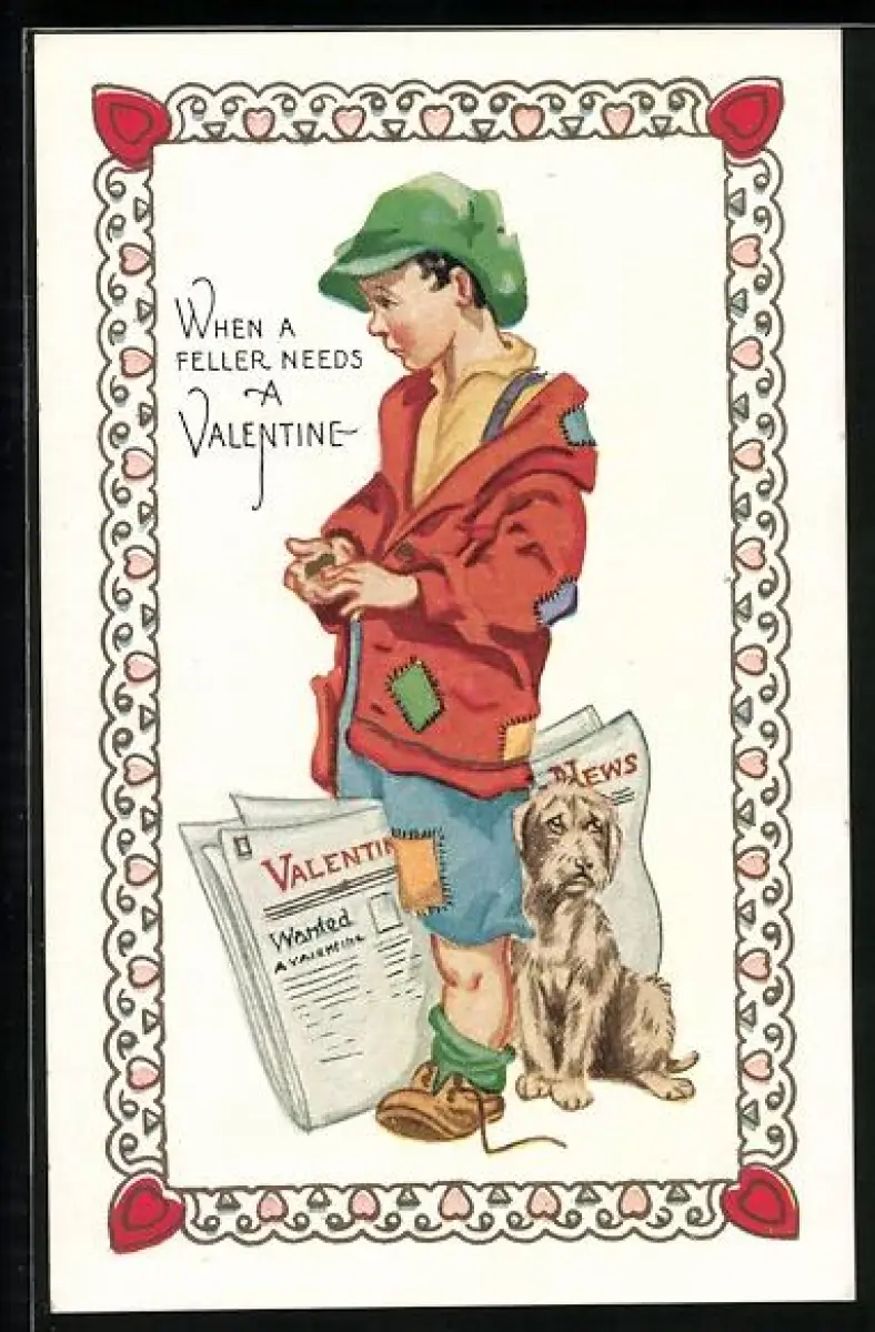Künstler-AK Kind mit Hund und Zeitung, When a feller needs a Valentine