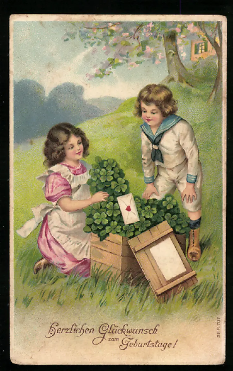 Künstler-AK Kinder mit Kleeblättern in der Kiste zum Geburtstag