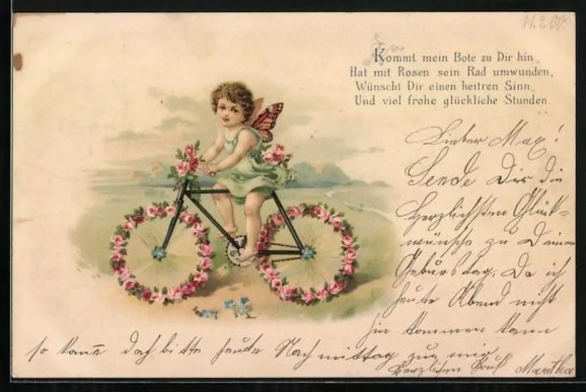 Künstler-AK Kleine Fee fährt auf einem Fahrrad mit Blumen-Reifen