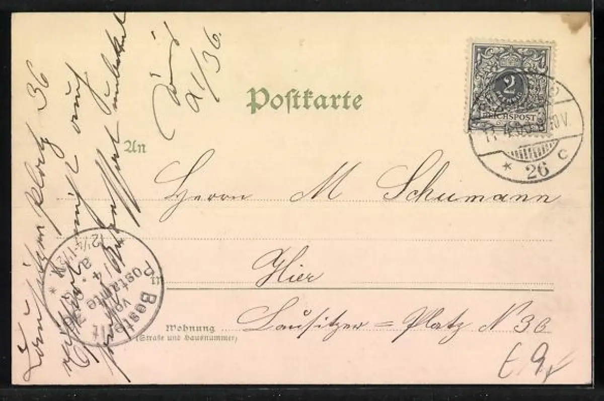 Personenbezogene Daten auf der Rückseite der Karte wurden durch blauen Textmarker unkenntlich gemacht. Die blauen Stellen sind auf die Vorderseite durchgeweicht und wirken sich negativ auf das Postkartenfoto aus