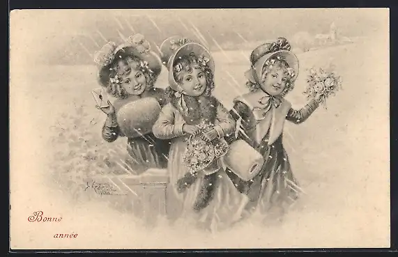 Künstler-AK Kränzle: Drei junge Mädchen mt Blumen und Brief im Schnee, Neujahrskarte