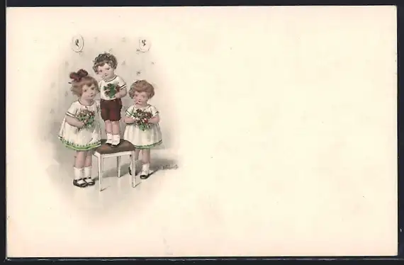 Künstler-AK Kränzle: Zwei Mädchen und der kleine Bruder mit Blumen