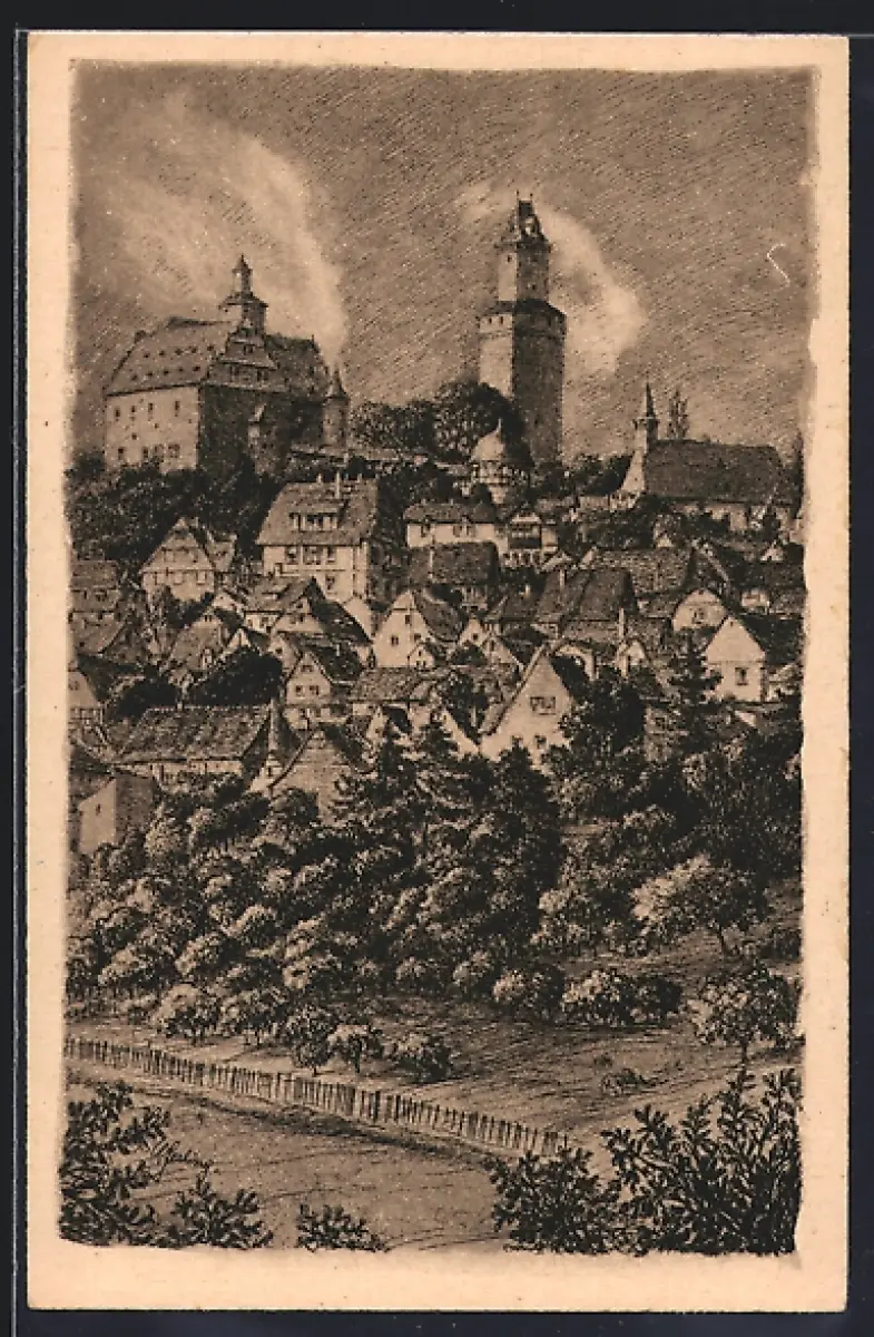 Künstler-AK Kronberg im Taunus, Burg, Stadtturm, Altstadt