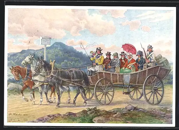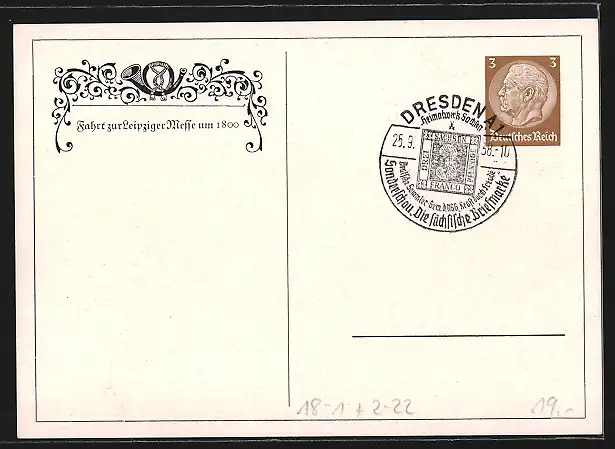 Künstler-AK Leipzig, Werbeschau der DSG 1938, Fahrt zur Leipziger Messe um 1800, Ganzsache