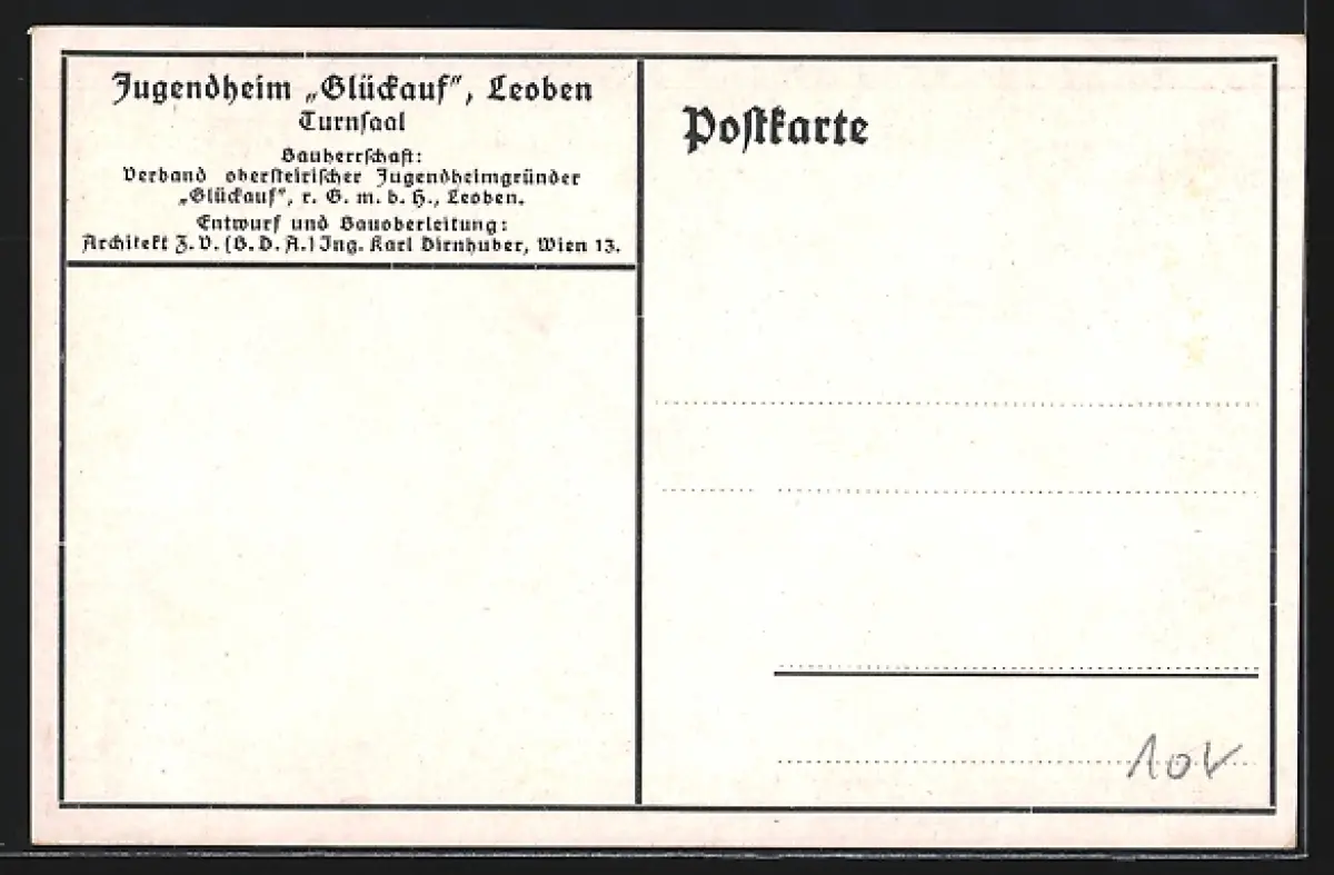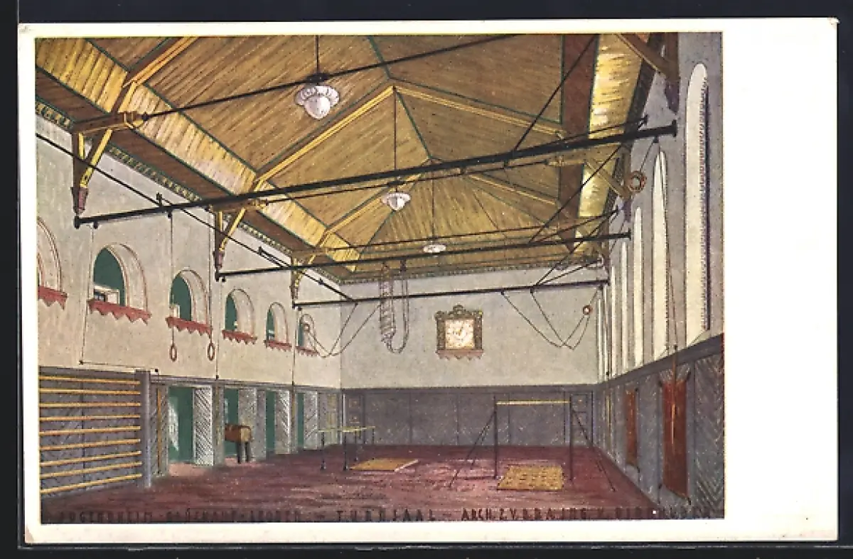 Künstler-AK Leoben, Jugendheim Glückauf, Turnsaal, Innenansicht