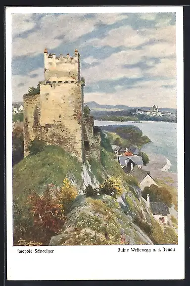 Künstler-AK Leopold Schweiger: Weitenegg a. d. Donau, Ruine, Teilansicht mit Blick auf den Ort