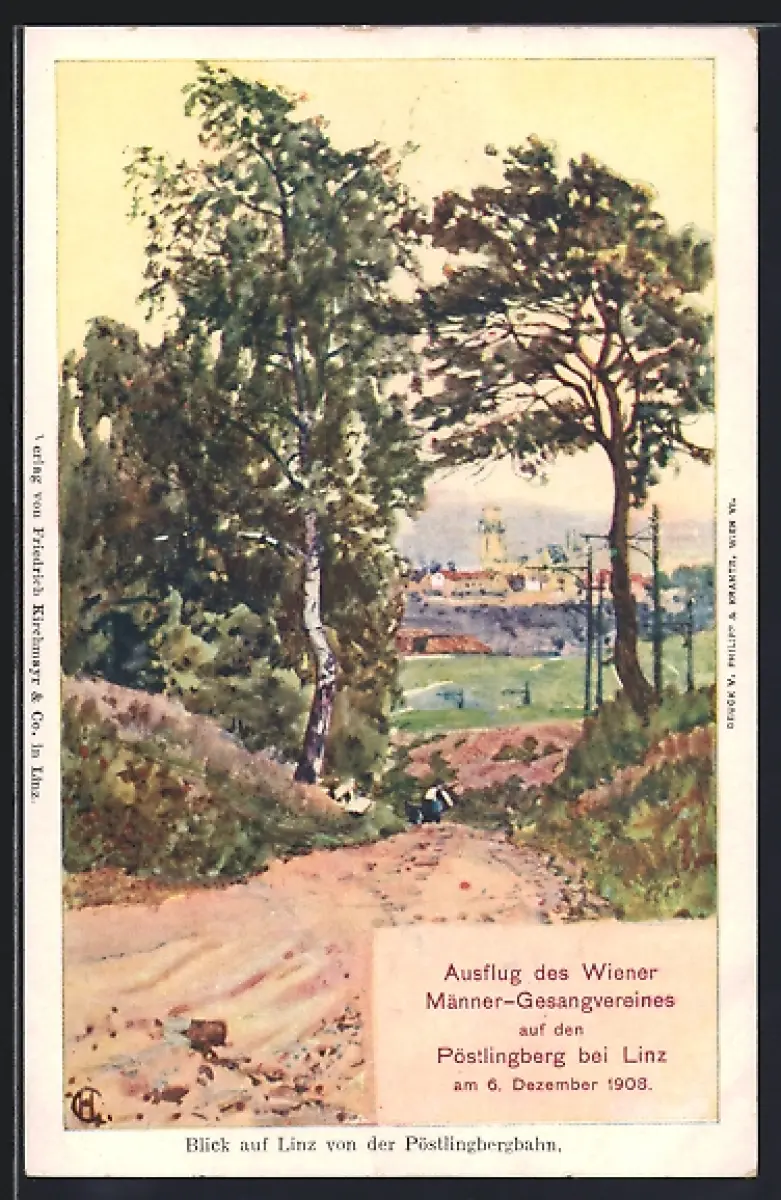 Künstler-AK Linz, Ortsansicht von der Pöstlingbergbahn, Ausflug d. Wiener Männergesangvereines 1908