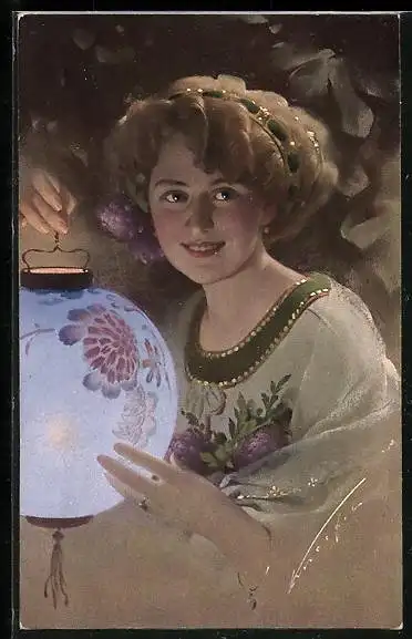 Künstler-AK Ludwig Knoefel: Hübsche Frau hält einen verzierten Lampion in Händen