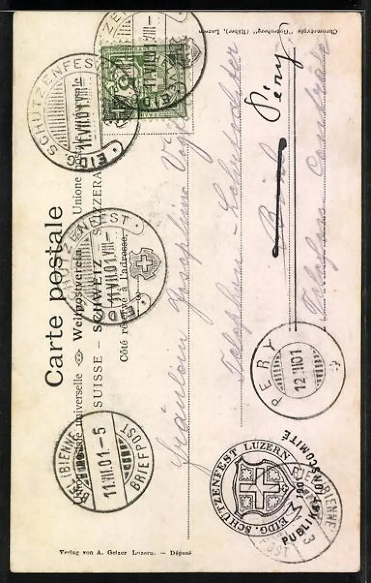 Künstler-AK Luzern, Schützenfest 1901, Bannerturm und kleine Restauration, Wappen