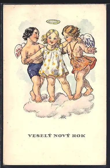 Künstler-AK M. Fischerova-Kvechova (MFK): Zwei Engel und ein Kind stehen auf einer Wolke