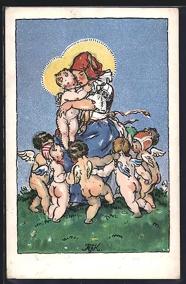 Künstler-AK M.Fischerova-Kvechova (MFK): Engel tanzen um die Heilige mit Kind auf dem Arm