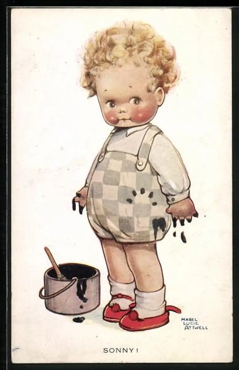 Künstler-AK Mabel Lucie Attwell: Kind mit schwarzer Farbe an den Händen, Sonny