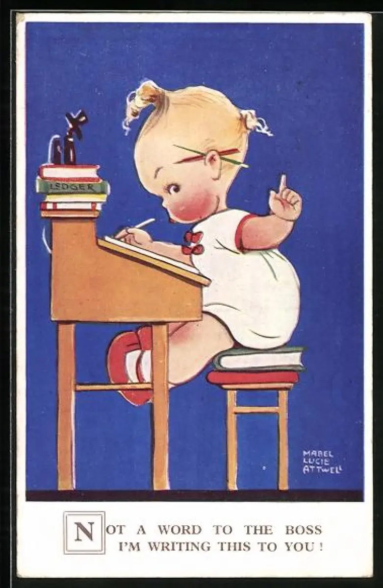 Künstler-AK Mabel Lucie Attwell: Kleinkind schreibt einen Brief, Not a word to the boss...