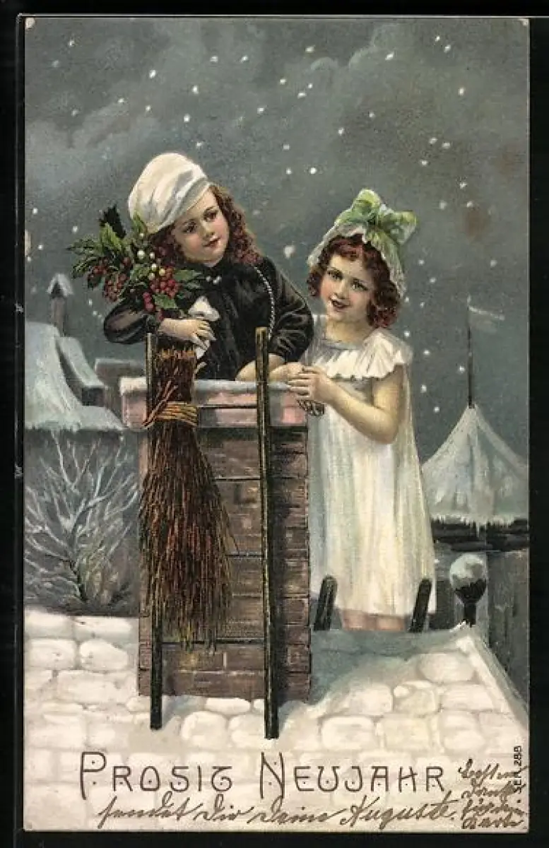 Künstler-AK Mädchen und Schornsteinfeger stehen am Schornstein, Prosit Neujahr