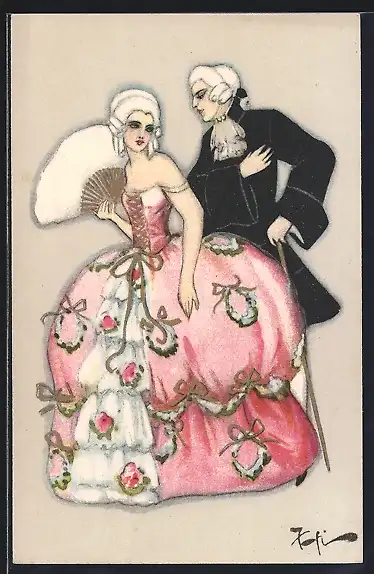 Künstler-AK Mann steht hinter Frau mit Fächer, Art Deco