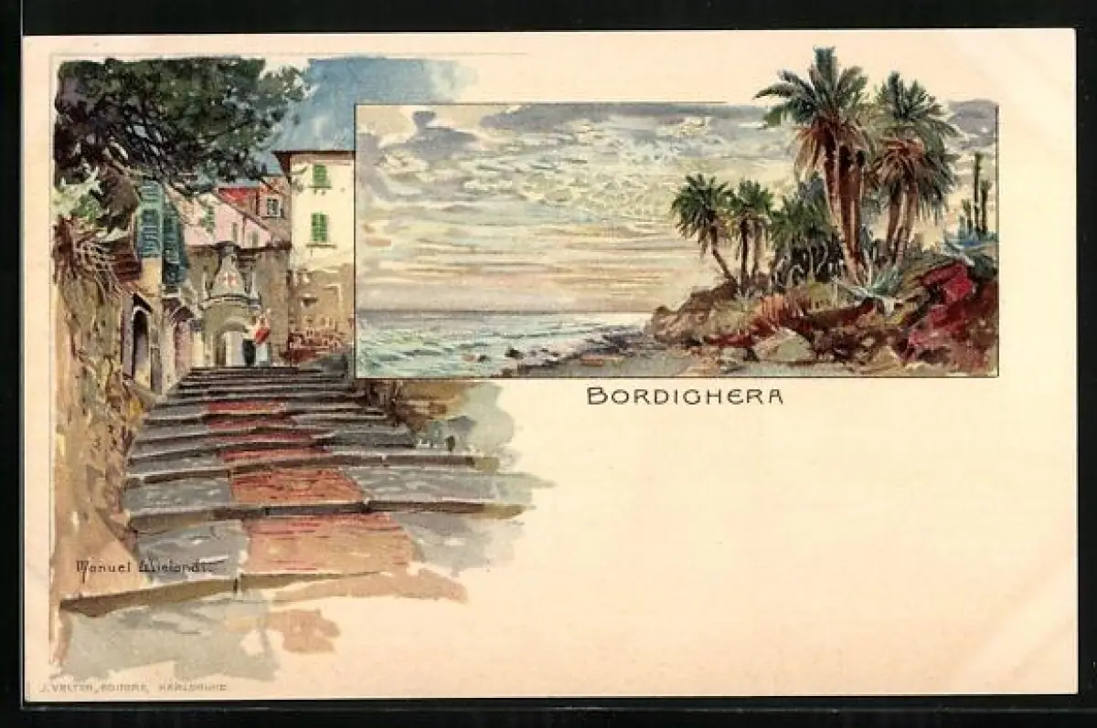 Künstler-AK Manuel Wielandt: Bordighera, Strassenpartie, Palmen am Strand