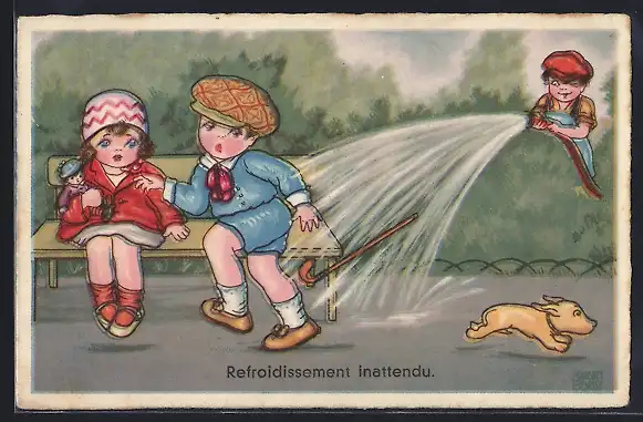Künstler-AK Margret Boriss: Gärtner begiesst Pärchen mit dem Gartenschlauch