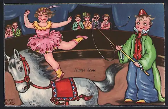 Künstler-AK Margret Boriss: Mädchen steht im Zirkus auf Pferderücken, Manege mit Clown