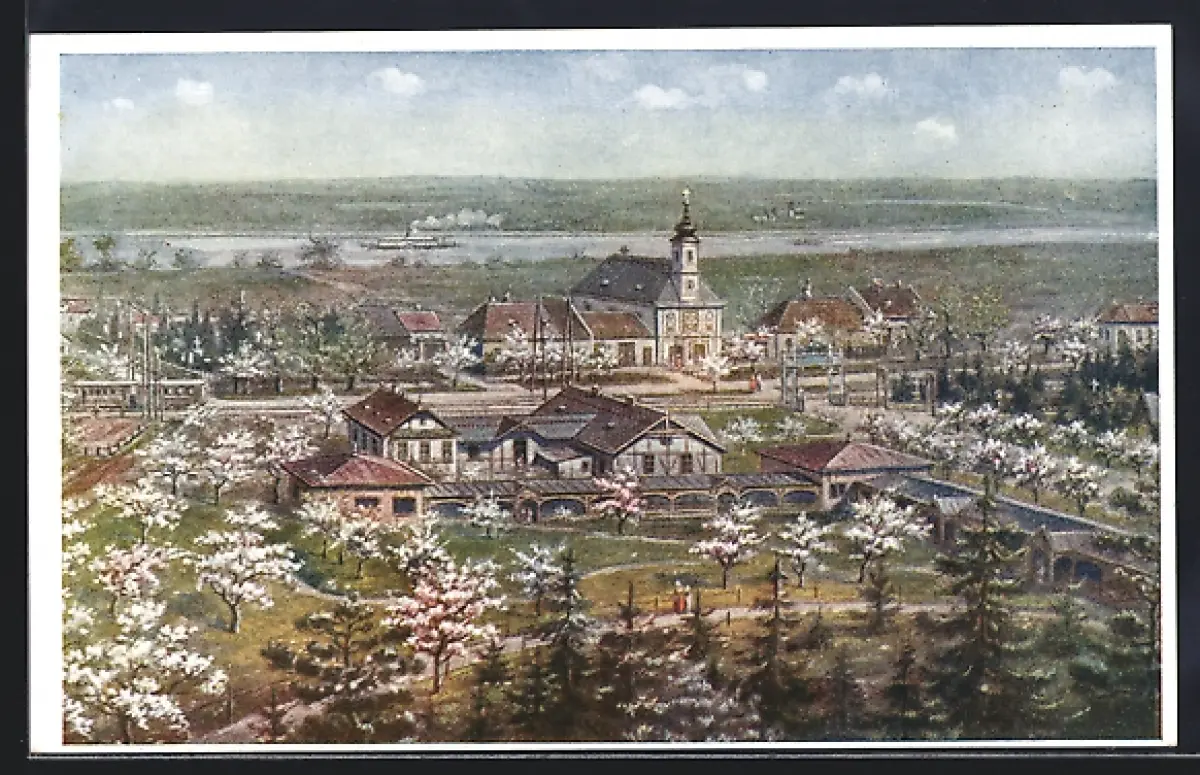 Künstler-AK Maria Ellend / Donau, Totalansicht im Frühling