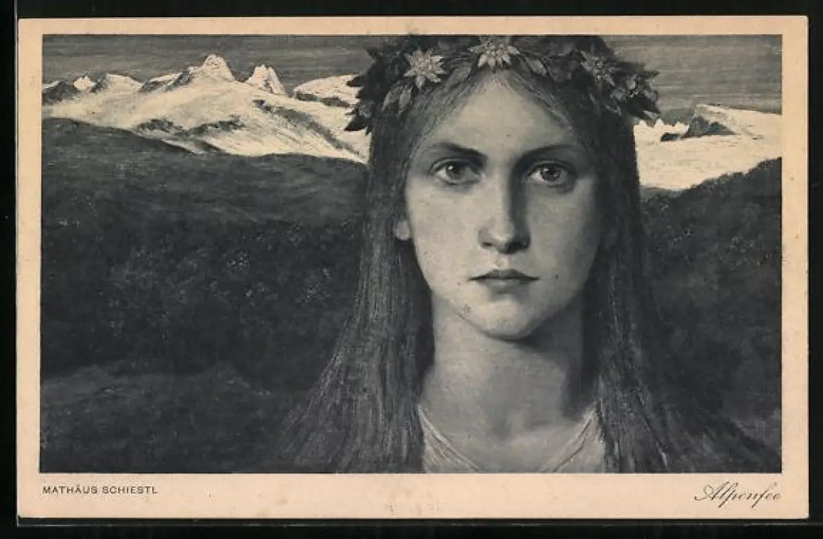 Künstler-AK Matthäus Schiestl: Alpenfee, Junge Frau mit Blumenkranz