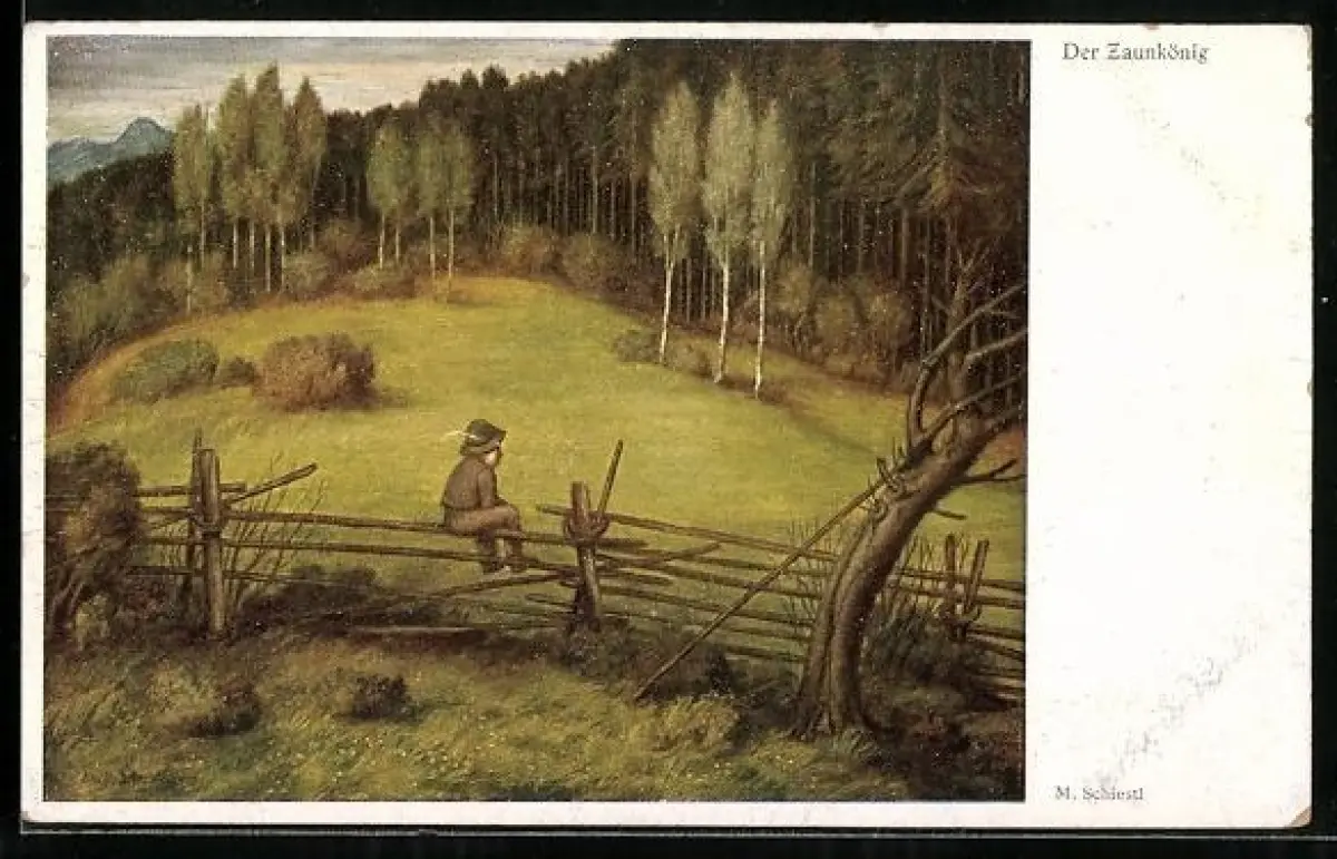 Künstler-AK Matthäus Schiestl: Kleiner Junge sitzt auf dem Zaun am Waldrand