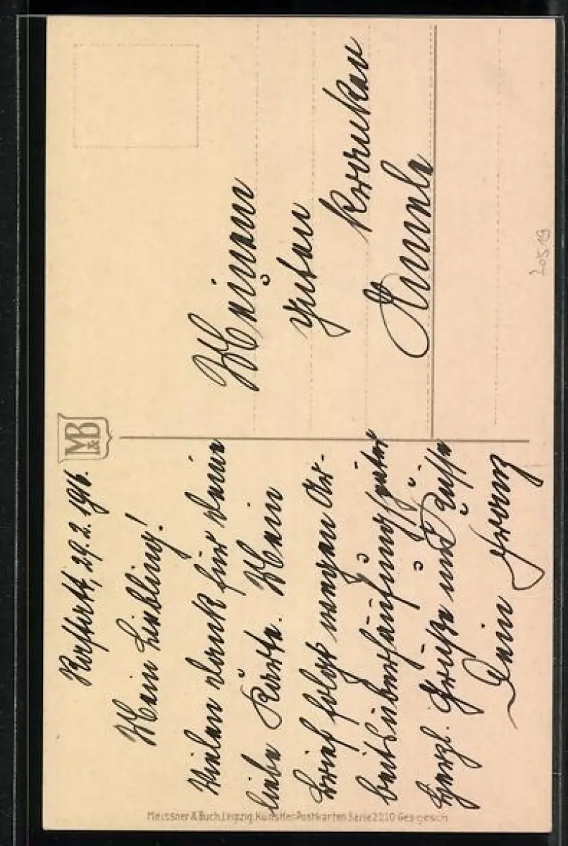 Personenbezogene Daten auf der Rückseite der Karte wurden durch blauen Textmarker unkenntlich gemacht. Die blauen Stellen sind auf die Vorderseite durchgeweicht und wirken sich negativ auf das Postkartenfoto aus