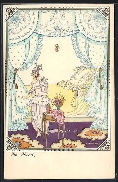 Künstler-AK Mela Köhler: Frau in Rüschenkleid an ihrem Bett, Am Abend