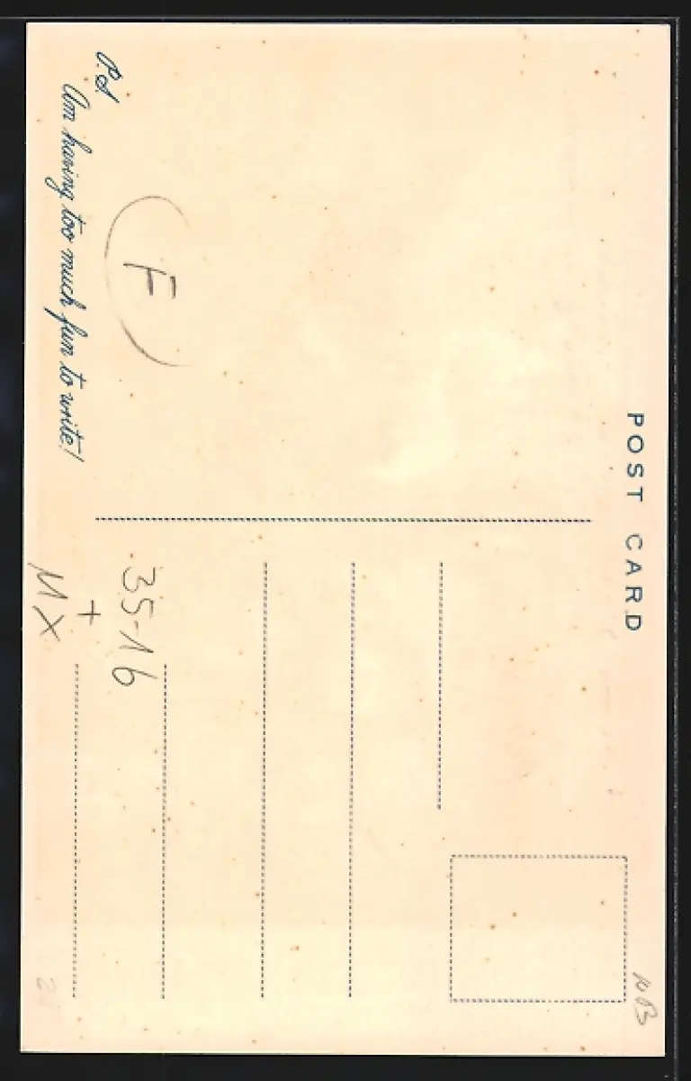 Personenbezogene Daten auf der Rückseite der Karte wurden durch blauen Textmarker unkenntlich gemacht. Die blauen Stellen sind auf die Vorderseite durchgeweicht und wirken sich negativ auf das Postkartenfoto aus