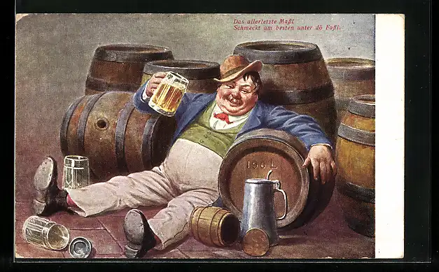 Künstler-AK München, Das allerletzte Massl schmeckt am besten unter dö Fassl, Biertrinker