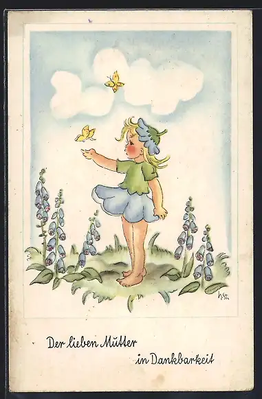 Künstler-AK Muttertag, Kleine Blumenfee und Schmetterlinge
