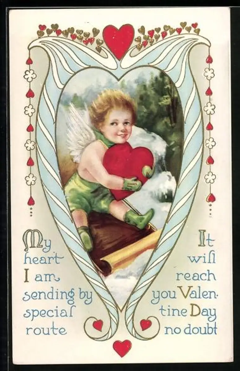 Künstler-AK My Heart I am sending..., Engel mit Herz auf einem Schlitten