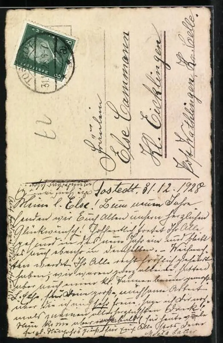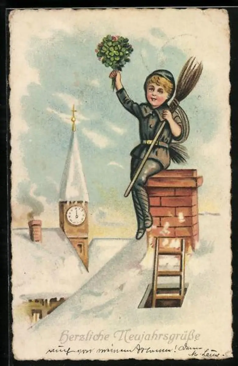Künstler-AK Neujahrsgruss, Schornsteinfeger auf einem verschneiten Dach